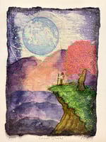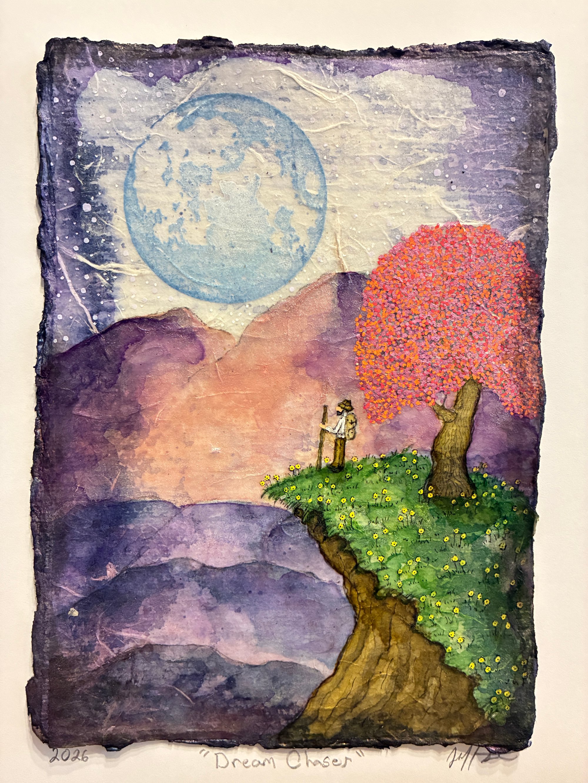 Ink wash, pen, paint pens, and varnish on two layers of handmade paper.