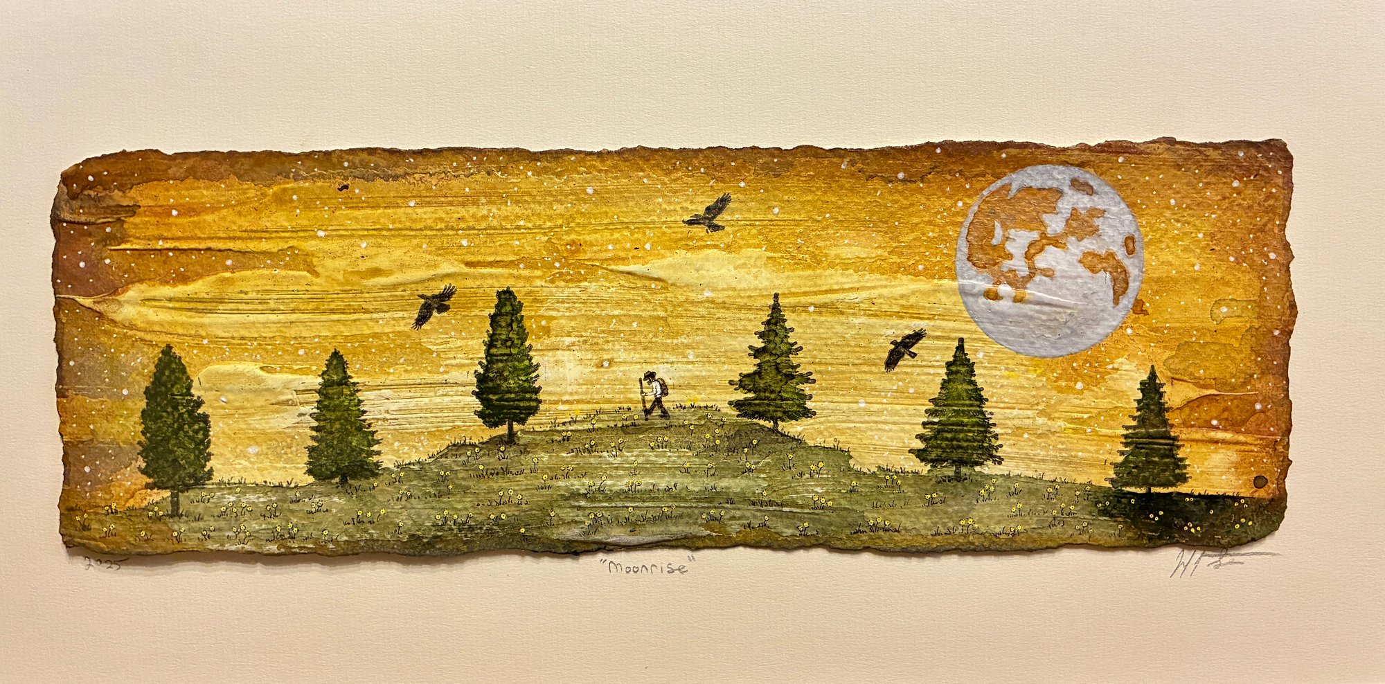 Ink wash, pen, varnish, paint pens on mixed media paper.